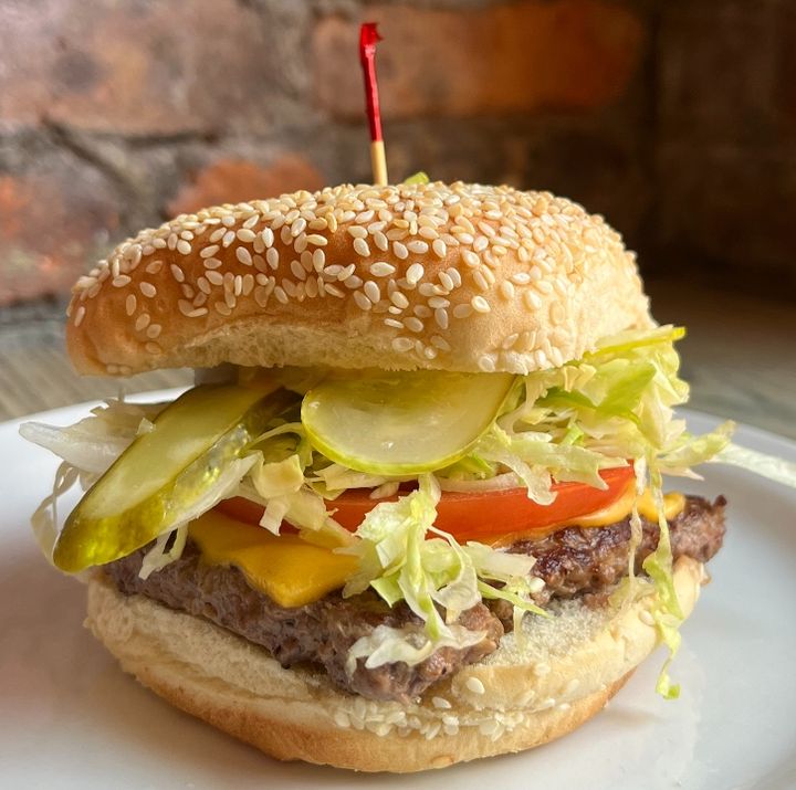 Double beef patty, american cheese, lettuce, tomato, onion, pickles, mustard, mayo, sesame bun.