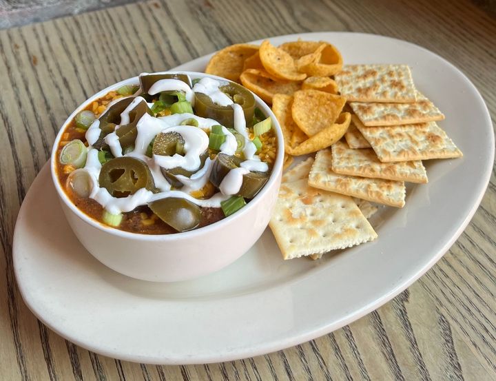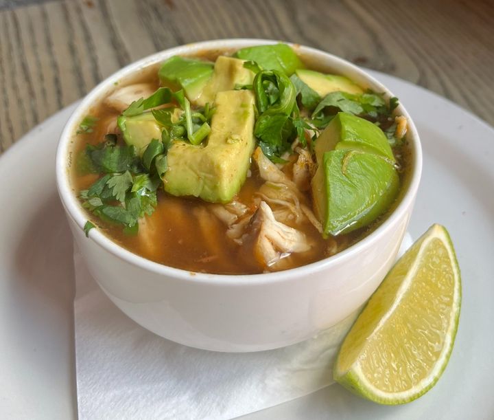 Shredded roasted whole chicken, broth, white cheddar, cilantro, tortilla strips, diced onion, avocado.