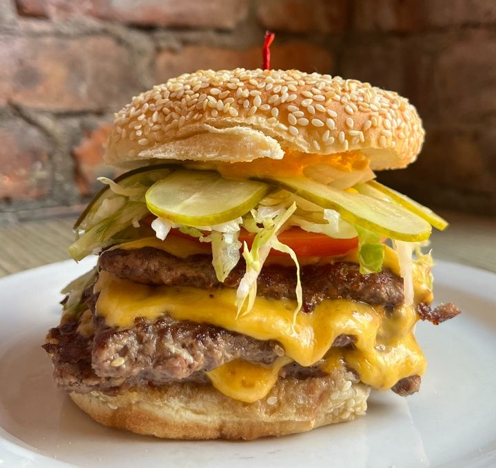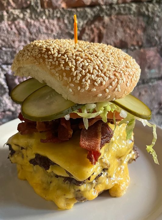 Quadruple beef patty, bacon, american cheese, lettuce, tomato, onion, pickles, mustard, mayo, sesame bun.