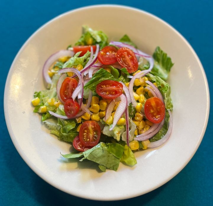 Corn, zuchinni, refried beans, pickled red onions, green salsa, corn tortilla.