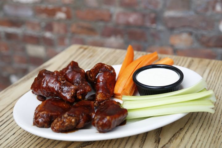Choice of BBQ, Buffalo, Sweet & Spicy/Soy-Ginger, or Mango Habanero. Choice of Blue Cheese or Ranch. Breaded jumbo chicken wings served with carrots and celery.